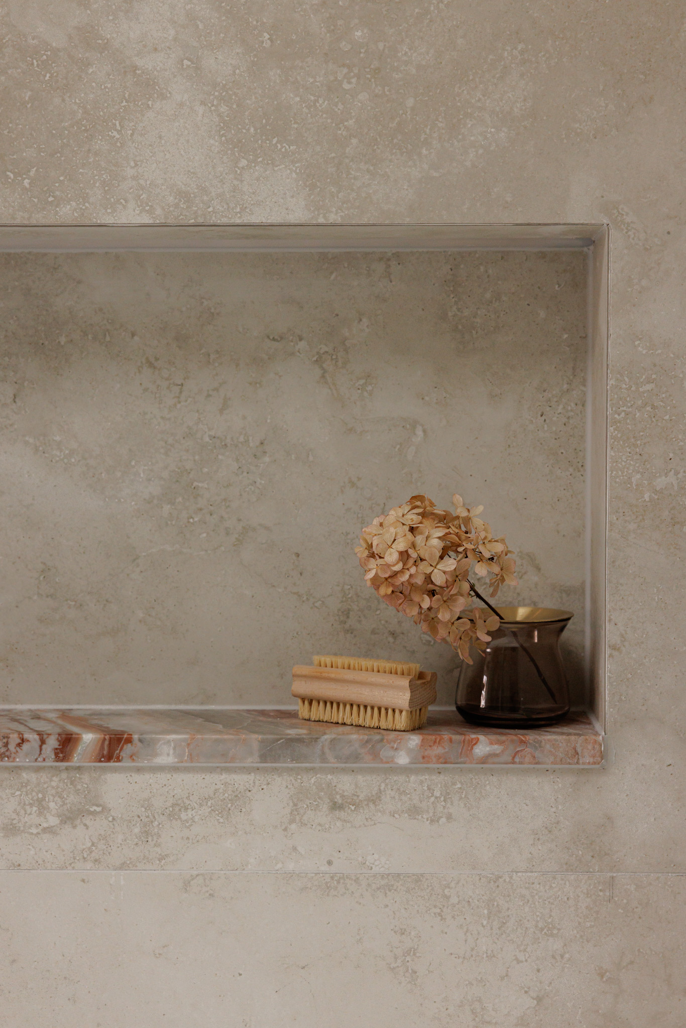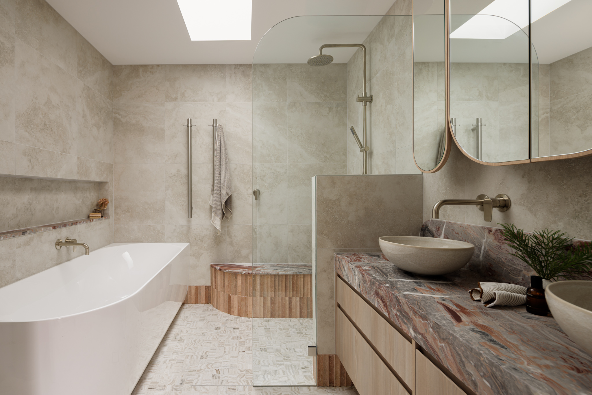 Guided by their love of bold colour and natural materials, we designed two distinct yet connected spaces: a playful, light-filled bathroom for the children and a serene, refined ensuite for the parents. Travertine-look tiles and natural stone mosaics add warmth and texture, while Rosso Orobico stone, with its soft pink and plum tones, brings a touch of personality and quiet luxury.